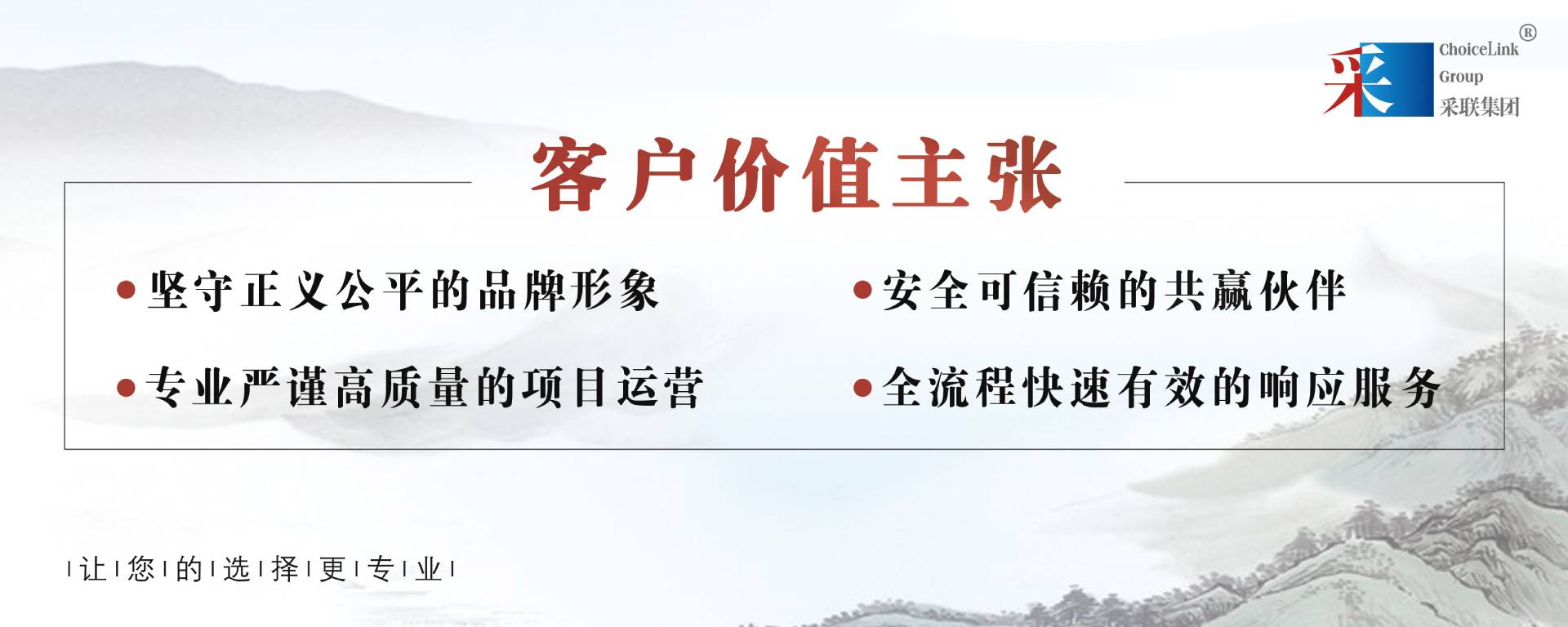 采聯(lián)集團致力于為廣大客戶提供采購全流程專業(yè)服務,堅守“守正出奇”的核心價值觀,以公平公正為原則,不斷優(yōu)化服務、堅持創(chuàng)新發(fā)展。依托多元化、專業(yè)化的服務,不斷向“締造最具創(chuàng)新力的采購服務品牌,構(gòu)筑采購領(lǐng)域最專業(yè)的資源交互平臺”的遠大愿景邁進。